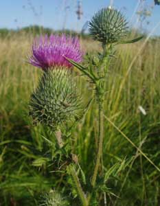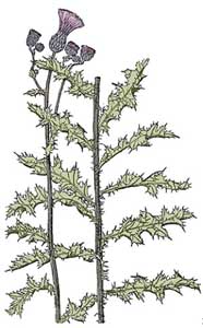 Строение: 50-120см; корневище ползучее; стебли прямые, наверху ветвистые; листья перисто-раздельные, до мелко-зубчатых, на краях с колючками; корзинки 15-20 мм в диаметре;цветки фиолетово- красные; семянки 4 мм в длину с длинным перистым хохолком. Произростает: Ев., Аз., Сев. Аф.; вторично Сев. Ам.
